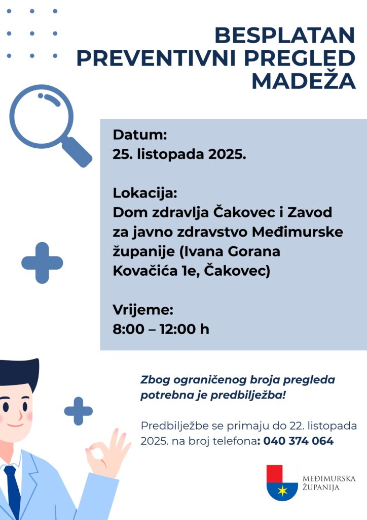 ČAKOVEC – Međimurska županija, u suradnji s Domom zdravlja Čakovec, županijskim Zavodom za javno zdravstvo te specijalistima dermatovenerologije iz Međimurja, organizira projekt posvećen zdravlju građana. Riječ je o besplatnom pregledu madeža s ciljem educiranja ljudi, te pravovremenog otkrivanja zloćudnih promjena – poručuju iz ureda međimurskog župana.